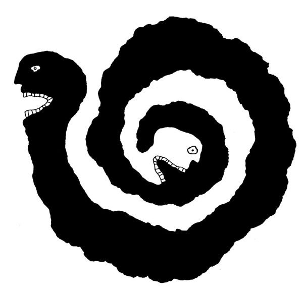 Miközben pörgettem a laptopomon e kiállítás anyagát, néha kimentem a szobámból, hogy megnézzek némely munkáján egy-egy részletet. Nagy tisztesség, hogy kaptam, kaptunk tőle anno igen finom rajzokat, némelyik majdnem egyezett a műtárgylistával, természetesen csak majdnem, hisz fontosabb motívumait többször megrajzolta. Igen, használta magát, forgatta a gazdag Tettamanti-szótárt. Tényleg össze lehetne egy ilyet állítani, akár e kiállítás alapján, kígyó, kerék, és számos alkerekei, létra, sínpár, labirintus, szem, könyv, ecset, toll, nem csoda, hisz utóbbiakon keresztül vett levegőt, hihetetlen szorgalma és munkabírása volt, ami nélkül nem lett volna semmi, még az ő páratlan rajztehetségével sem, de hát egy nagy művész dolgozni is tud, a játék nem játék.