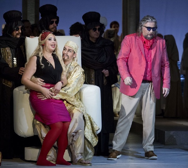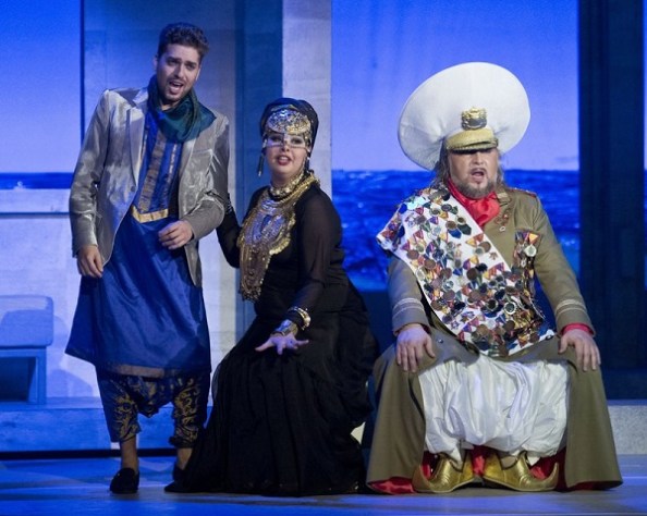A darab meséje (a szövegkönyv írója, őt se hagyjuk ki, Angelo Anelli) valóban „képtelen bolondság”: az algíri bej, Musztafa (Palerdi András) megunta a feleségét (Elvira/Sáfár Orsolya). Megunhatná a velencei dózse is, de az egzotikus helyszín és az arisztokratikus közeg feldobja a történetet. Musztafa száműzi Elvirát és bizalmasát, Zulmát (Kálnay Zsófia), férjéül szánva olasz rabszolgáját, Lindorót (Spencer Britten). Ő maga egy tüzes olasz nőre vágyik, nézi is lelkesen az Édes életből Anita Ekberget, amint besétál a Trevi kútba. (Ekberg a filmben ugyan amerikai sztárt alakít, de miért kéne ezt egy algíri bejnek tudnia?)