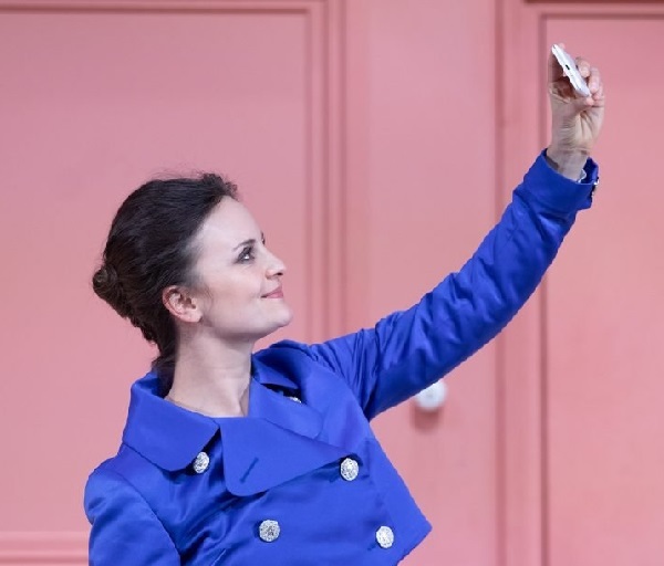 Hamlet (Fröhlich Kristóf) és a norvég király küldöttei, Guildenstern (Hartai Réka) és Rosenkrantz (Chován Gábor)