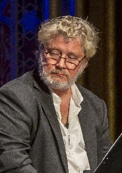 Az oratóriumszerűen zajló előadásban egyetlen ember mozgott: Móser Ádám, zeneszerző, harmonikaművész – persze ő is csak a hangszerével. Hat vagy hét alkalommal, az elhangzó szövegek között játszotta improvizatív, leginkább érzelmek hullámzását kifejező (vagy követő) műveit – pianissimótól a harmonikán elérhető fortissimóig. Nem tudom, hogy a záró zenedarab kiben mit idézett föl, én magam nem tudtam szabadulni az érzéstől, hogy a dallamban felhangzó és visszatérő töredék Máté Péter híres dalát – ami nagyon is idevágott – hozza elő: Egyszer véget ér…