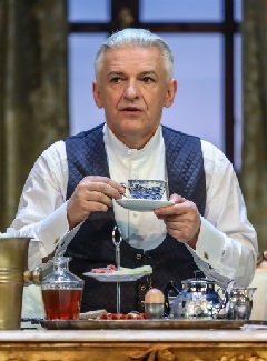 Amit látunk, illúziószínház a javából. Gazdag díszlet (Bagossy Levente), nagyvonalú, stílusos jelmezek (Szakács Györgyi); a gazdagságot sugárzó miliőbe belép három szmokingos úr… A játék stílusa ugyanakkor kicsit túl teátrális, gyanítom, direkt teremt némi kontrasztot, figyelmeztet minket, ne feledjük, színházat látunk. Ráadásul a szöveg maga állandóan beidézi a színházat – már a mutatós kezdésnél is, ami egyrészt humorforrás, másrészt bennfentessé teszi a nézőt, aki szemlátomást mulat ezen. Noha jómagam jobban szeretem azt a fajta színjátszást, amely némi megrendüléssel is jár, bevallom, hogy ebben a kissé felszínes, tét nélküli játékstílusban is akadtak élvezetes pillanatok. Tagadhatatlan, hogy a francia elnevezésekkel birkózó Almády (a régi szerető) szerepében Schmied Zoltán geg-özönnel örvendezteti meg a nézőket, miközben képes valamit felvillantani még a sarokba-szorított férfi megalázottságából is. Kiválóak az epizodisták: Dvornicsek, a lakáj szerepében Magyar Attila igazán figyelemre méltót nyújt, s a kevés szövegű Lehoczky titkárként Rada Bálint is észre véteti magát.
