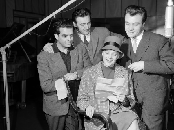 Róna Tibor Egy kis budapesti utazás – karosszékben című művének felvétele a Magyar Rádió 1-es stúdiójában (1961). Verebes Károly, Sinkovits Imre, Tolnay Klári és Bitskey Tibor (Fortepan / Szalay Zoltán)