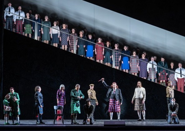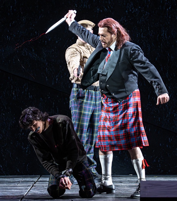Matthew Wild, a 2025. február 22-én bemutatott előadás rendezője a cselekmény idejét a nem túl távoli jövőbe helyezte, Skócia immár független ország, amelynek öntudatos urai őseik, a kelták viseletében, a kilt nevű szoknyában járnak (jelmez: Heide Kastler), a nők is skótkockás kosztümben pompáznak. Ez nem különösebben zavaró, bár nem is érthető, én legalábbis nem értettem. Nagyon tetszett viszont a függönyre vetített, időtlen és félelmetes erdő (videó: Czeglédi Zsombor): a fák között bármelyik században lehetünk. Tetszettek a vetített mondatok is; kár, hogy nem tudtam őket megjegyezni.