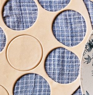 A deszkát, a sodrófát és a tésztát alaposan belisztezve kinyújtjuk a tésztát, amíg kb. olyan vastag lesz, mint egy alufóliába csomagolt csokoládéérme (3 mm). Alessandra azt is elmagyarázta, hogy ha túl vékonyra nyújtjuk a tésztát, a minták a két oldalon kioltják egymást.