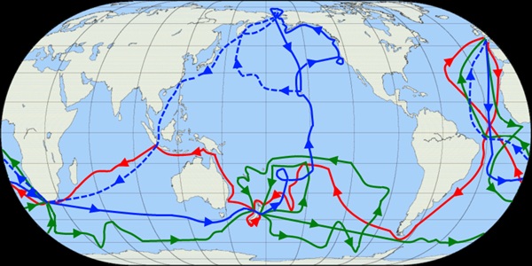 Cook kapitány felfedező útjai (A piros kék és zöld vonal Ausztráliától délkeletre a három déltengeri út) (© Andre Engels by Mariners’ Museum)